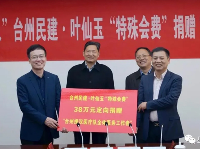 3月25日上午,民建臺州市委會在臺州市同心之家舉行致敬“最美抗疫人”臺州民建·葉仙玉“特殊會費”定向捐贈臺州援鄂醫療隊活動儀式。市人大常委會副主任、民建臺州市委會主...
