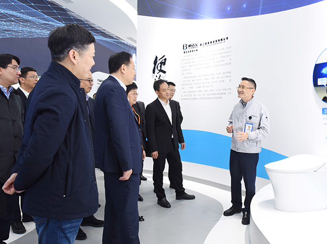 蔣亦標(biāo)總裁向領(lǐng)導(dǎo)一行詳細(xì)介紹了星星從三十多年前的家庭手工作坊成長(zhǎng)為如今多元發(fā)展的現(xiàn)代化企業(yè)集團(tuán)的奮斗歷程,指出當(dāng)前的星星通過(guò)穩(wěn)健經(jīng)營(yíng),旗下子公司產(chǎn)品銷售已遍布全球,持續(xù)多年躋身于中國(guó)制造業(yè)500強(qiáng)、全國(guó)民營(yíng)企業(yè)500強(qiáng)、浙江省百?gòu)?qiáng)制造業(yè)、國(guó)家高新技術(shù)企業(yè)企業(yè)行列,且在智能制造、綠色制造的道路上已經(jīng)走在行業(yè)前沿。下階段,星星將繼續(xù)深耕制造主業(yè),做大光電子產(chǎn)業(yè),做強(qiáng)智能馬桶產(chǎn)業(yè),做精冷鏈產(chǎn)業(yè),增強(qiáng)主要子公司在其行業(yè)的話語(yǔ)權(quán);同時(shí),強(qiáng)化生態(tài)園區(qū)建設(shè),通過(guò)做優(yōu)中小微企業(yè)的孵化與服務(wù),進(jìn)一步整合產(chǎn)業(yè)鏈,做好生態(tài)鏈工程,實(shí)現(xiàn)“再造一個(gè)星星”的目標(biāo)。隨后,星星冷鏈楊文勇總經(jīng)理與星星便潔寶總經(jīng)理黃朝陽(yáng)分別就各自在制造升級(jí)中的亮點(diǎn)與瓶頸向領(lǐng)導(dǎo)一行作了簡(jiǎn)要匯報(bào)。