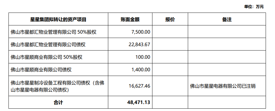 星星集團(tuán)擬將持有的佛山市星都匯物業(yè)管理有限公司、佛山市星順商業(yè)有限公司等 2 家公司的股權(quán)及債權(quán);以及佛山市星星制冷設(shè)備工程有限公司債權(quán)合計(jì) 4.85 億元資產(chǎn)一并打包轉(zhuǎn)讓。
