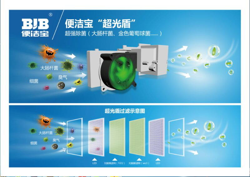 據便潔寶管董介紹,超光盾技術是最新的光觸媒技術,由二氧化和三氧化鎢組成。馬桶裝上這個“超光盾”神奇的小盒子后,對馬桶空氣中的細菌殺死率高達99% 而且長久有效,環保無毒無副作用